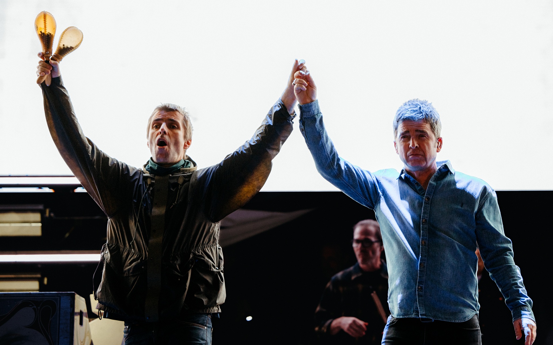Then, there they were. Exactly 16 years to the day since he allegedly swung a guitar in the general direction of his brother’s head backstage in France, Liam was holding up one of Noel’s hands triumphantly – the other flashing the peace sign – in a nightly walkout that’s become iconic as any track in the Oasis catalog. The two did a quick embrace and retreated to their assigned stage locations, with Noel toward stage left and Liam planted firmly at the center.